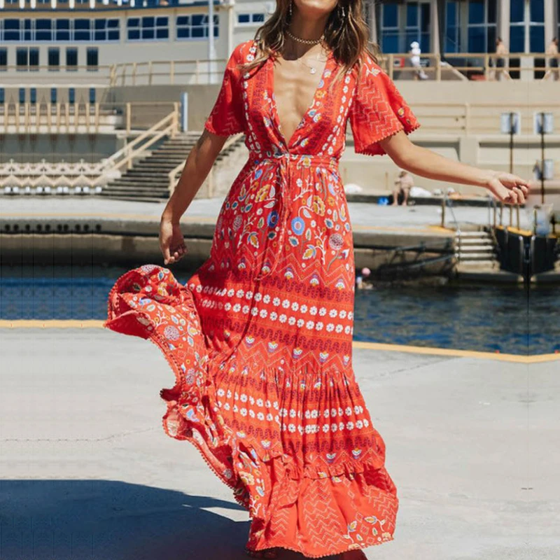 Vintage Chiffon Women Boho Dress Summer Holiday Floral Print Long Dresses Woman V Neck Short Sleeve